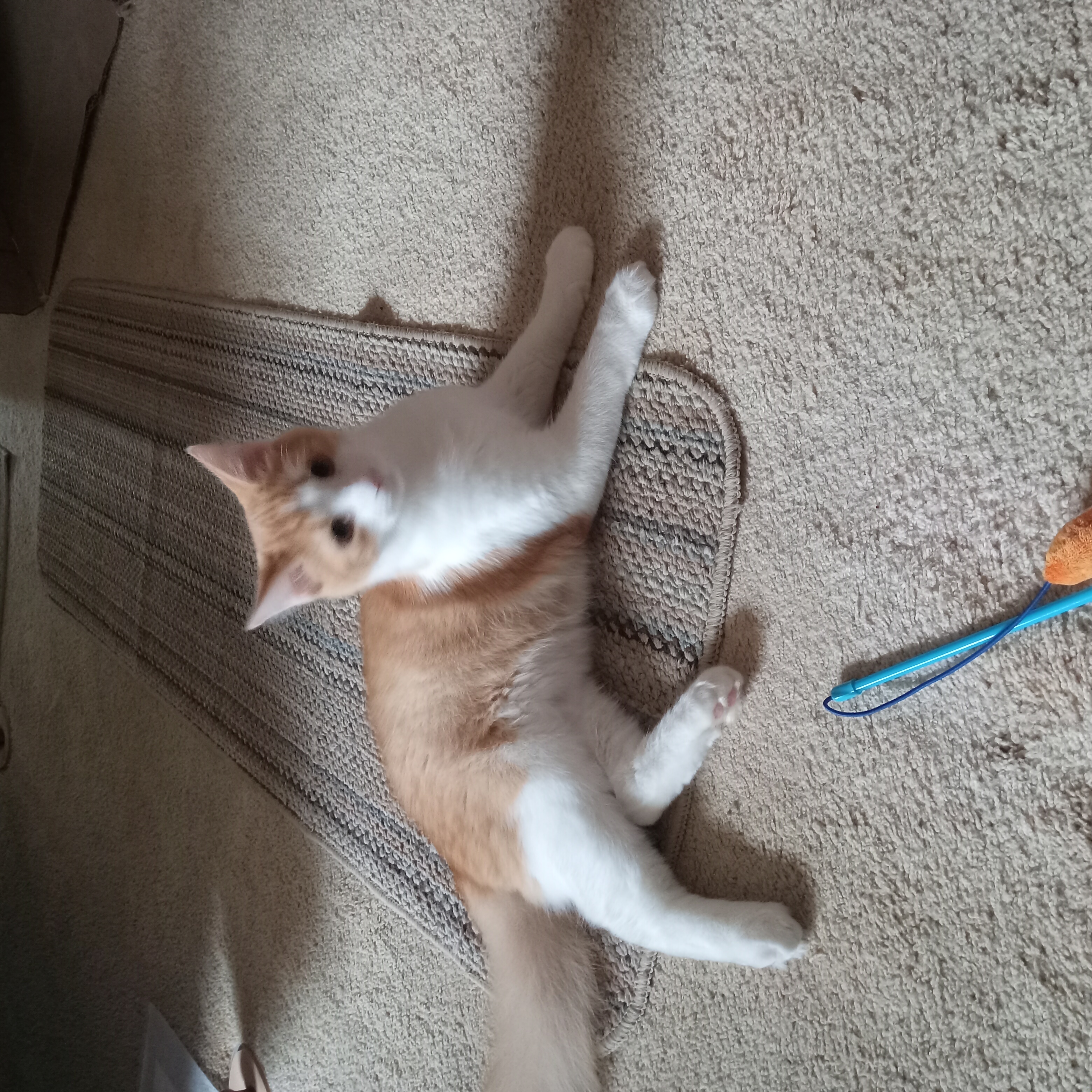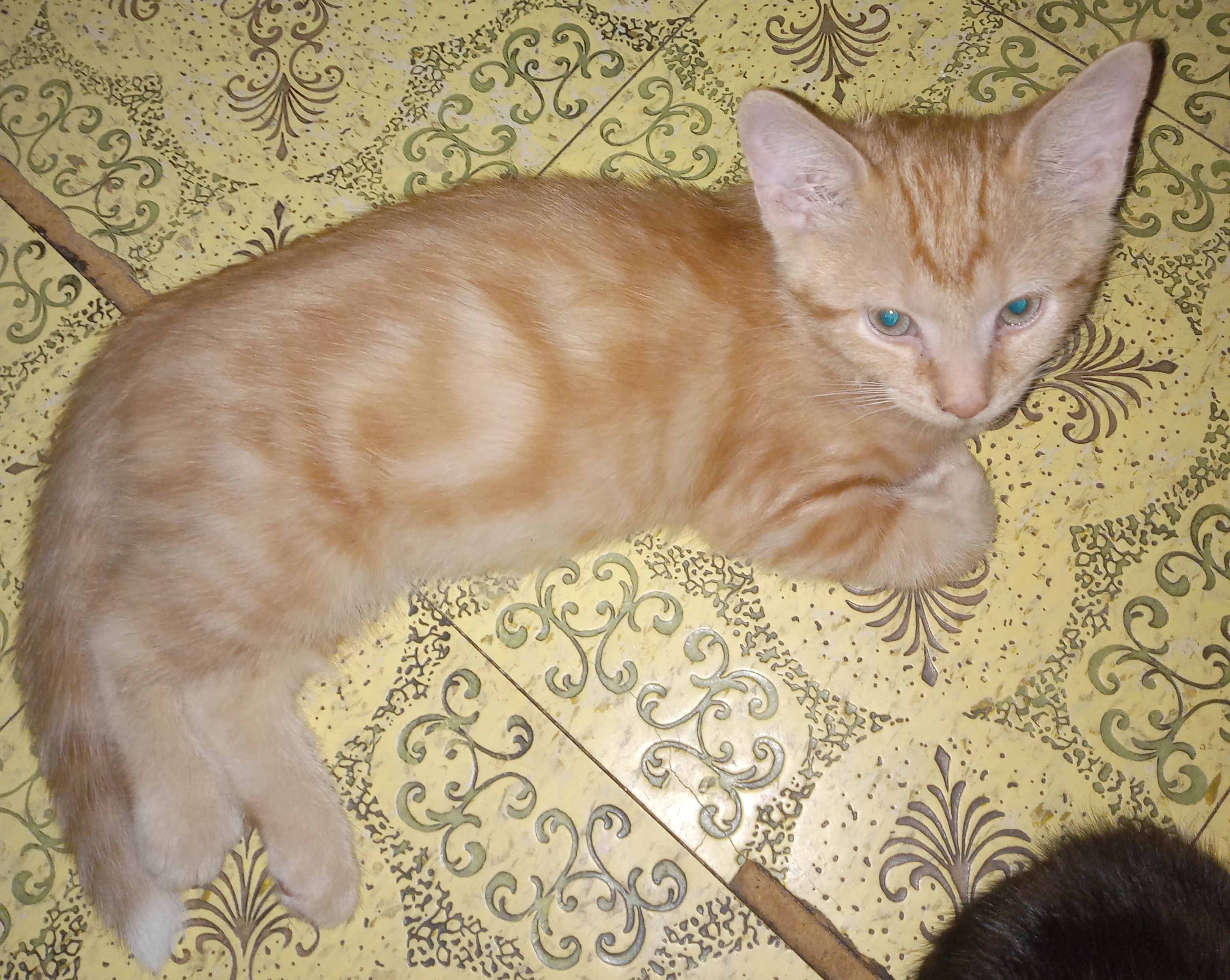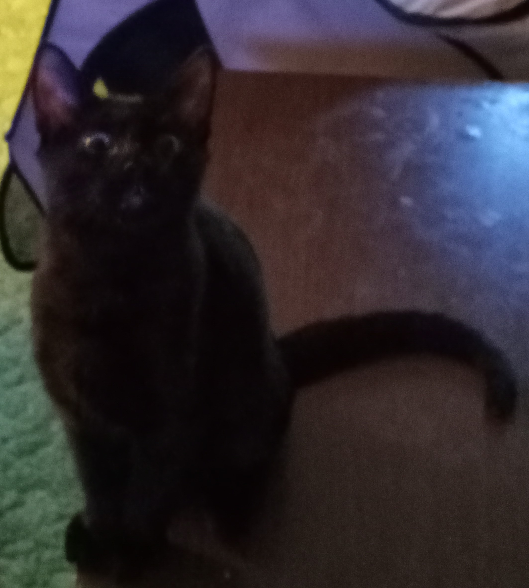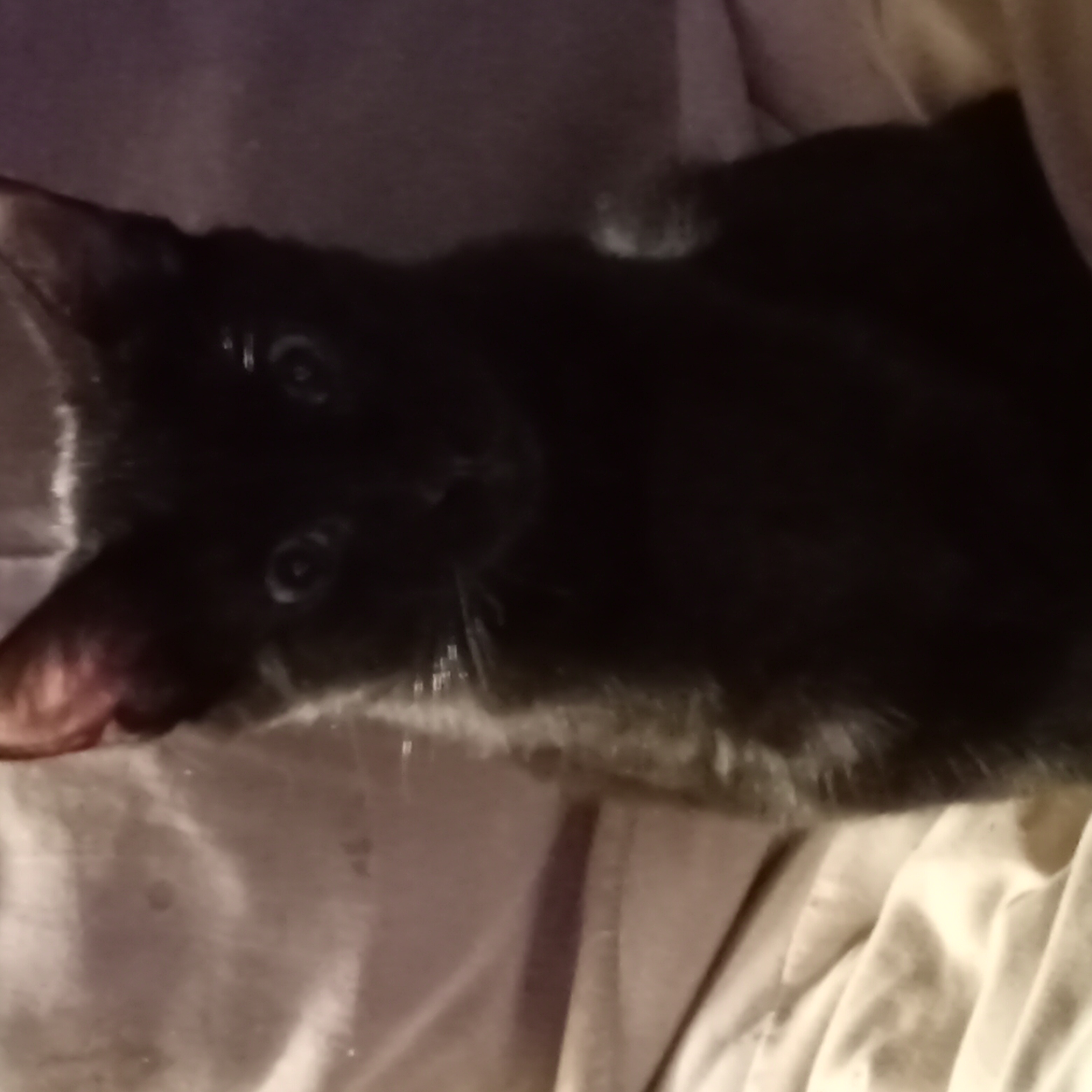 His name is "Beefy. Male kitten, likes to go around and play with his siblings. He is the largest one out of the others.