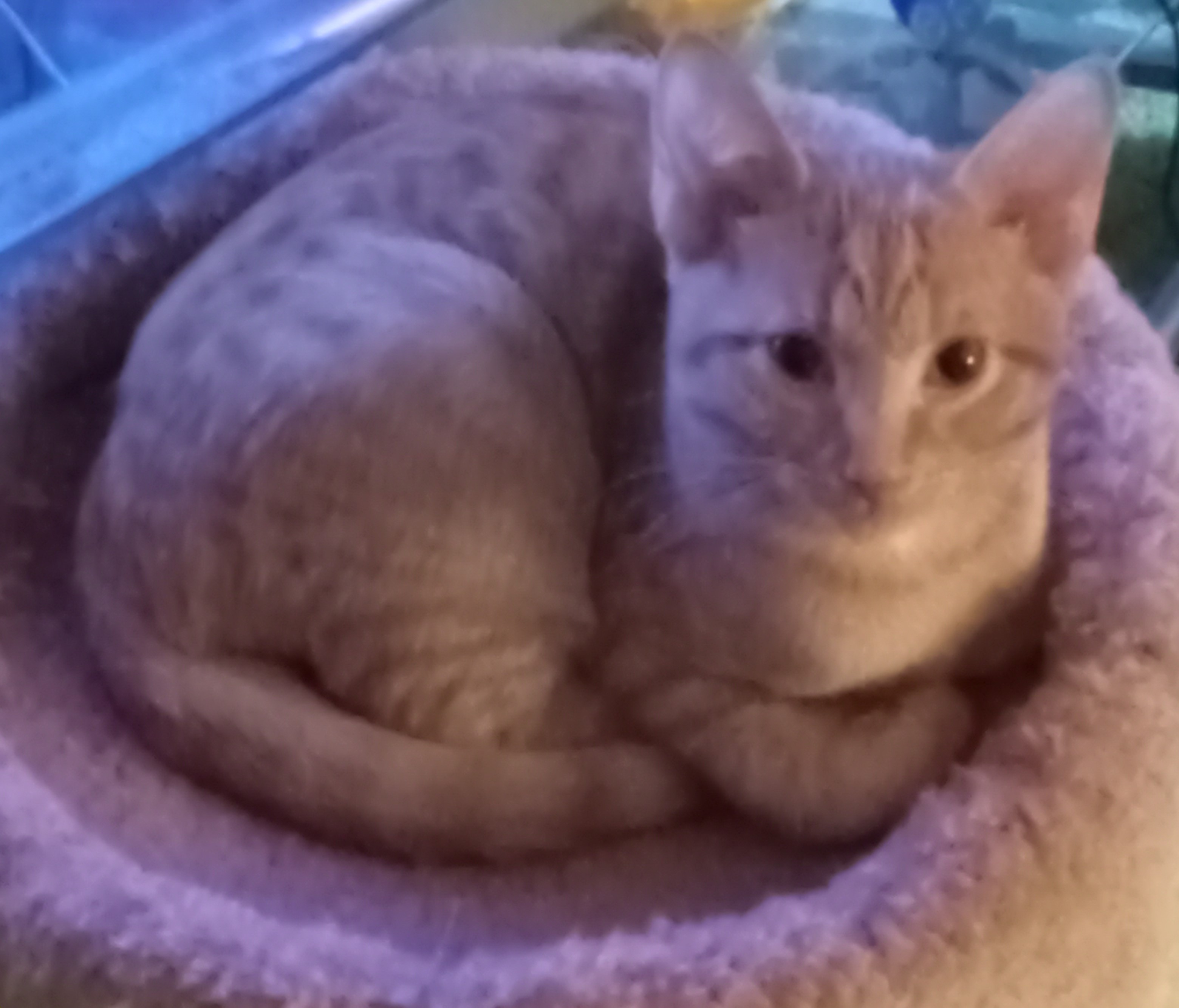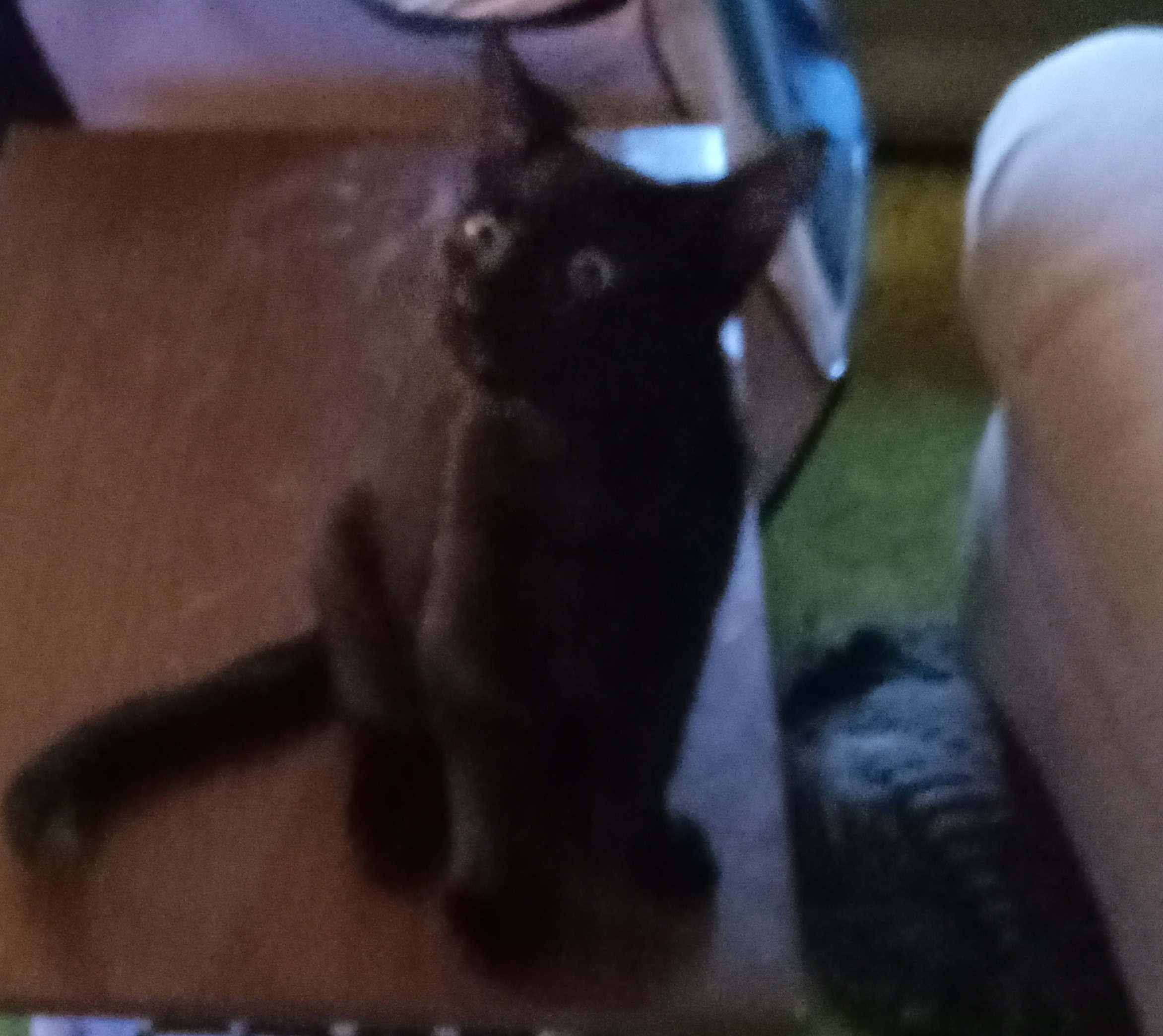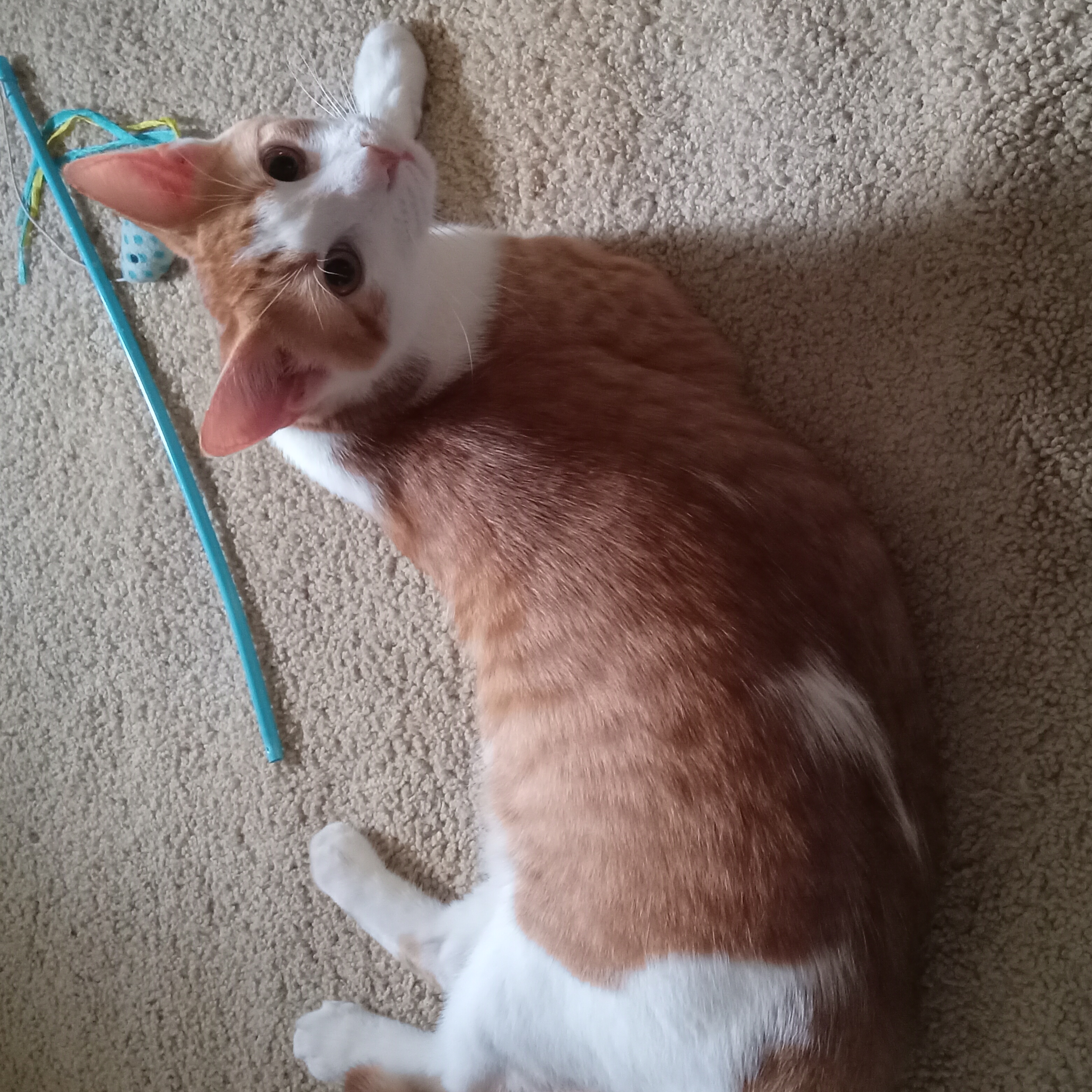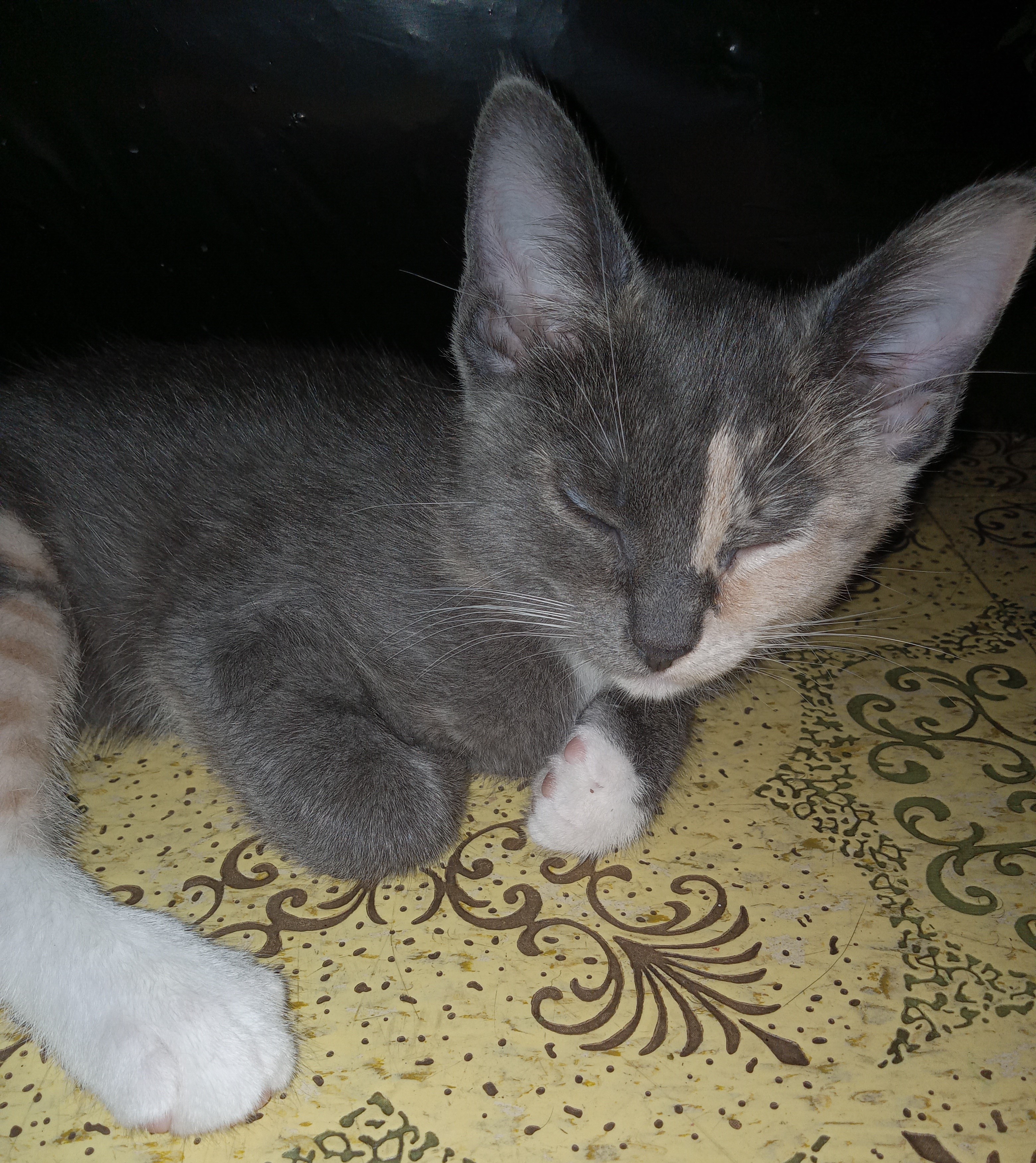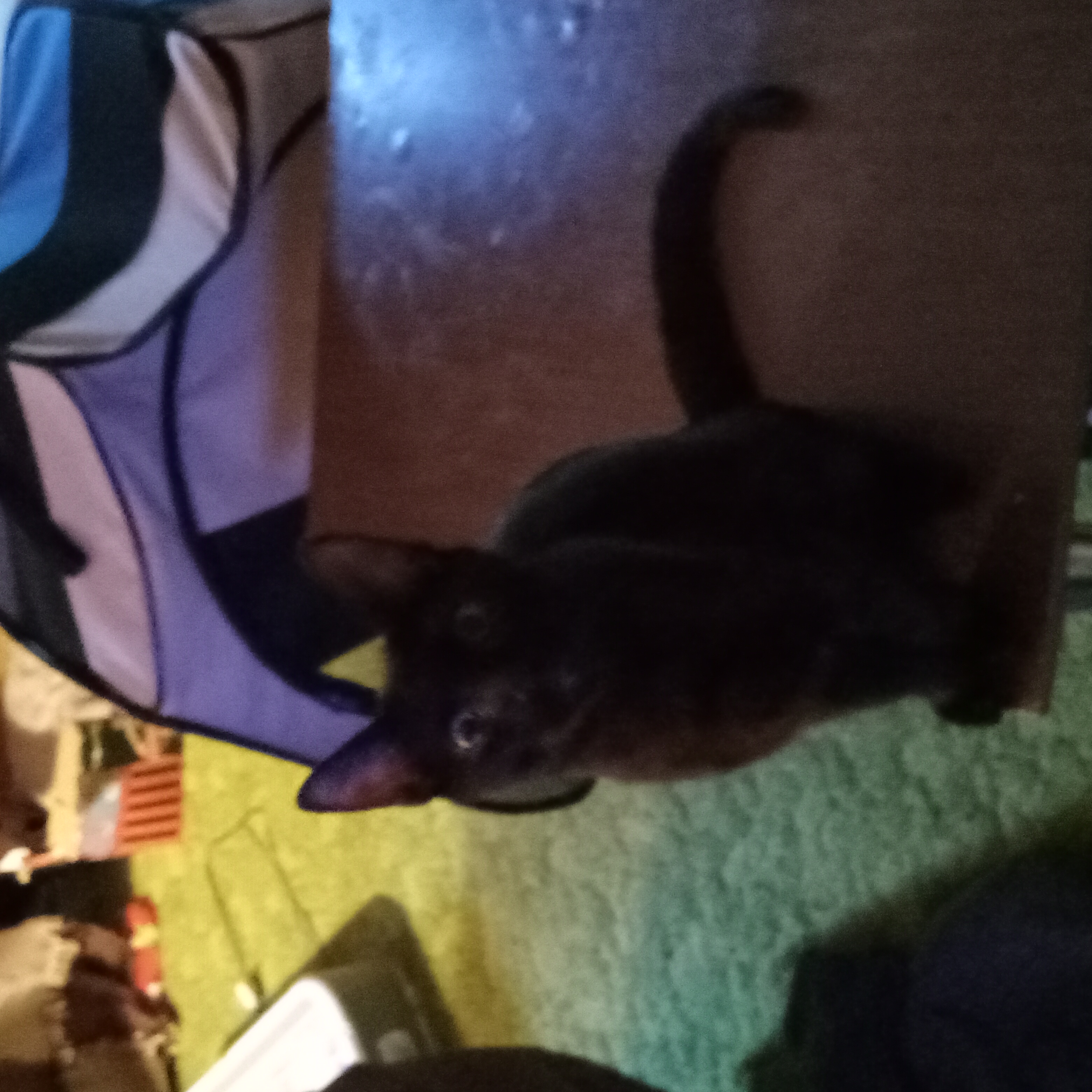His name is "Beefy. Male kitten, likes to go around and play with his siblings. He is the largest one out of the others.