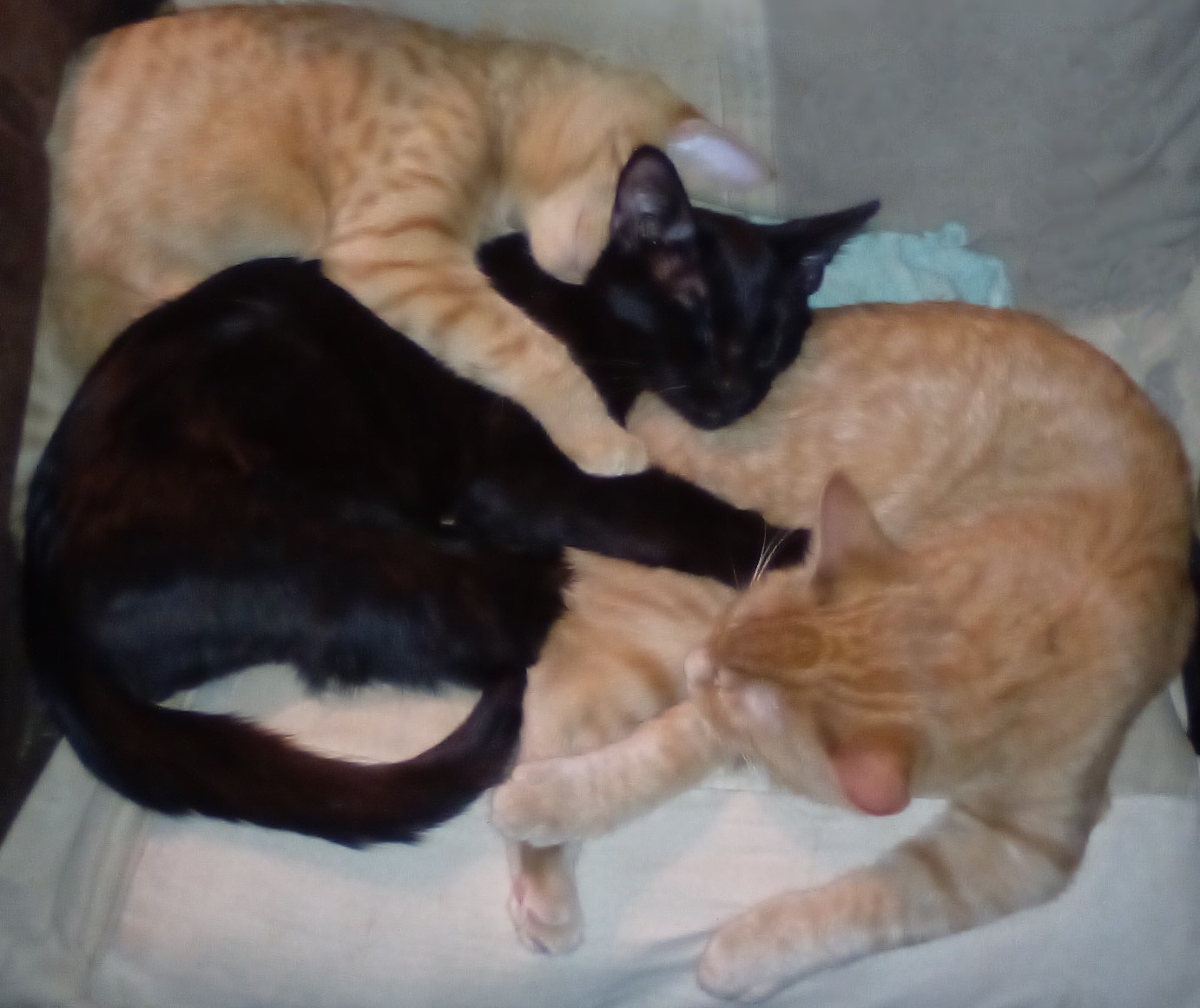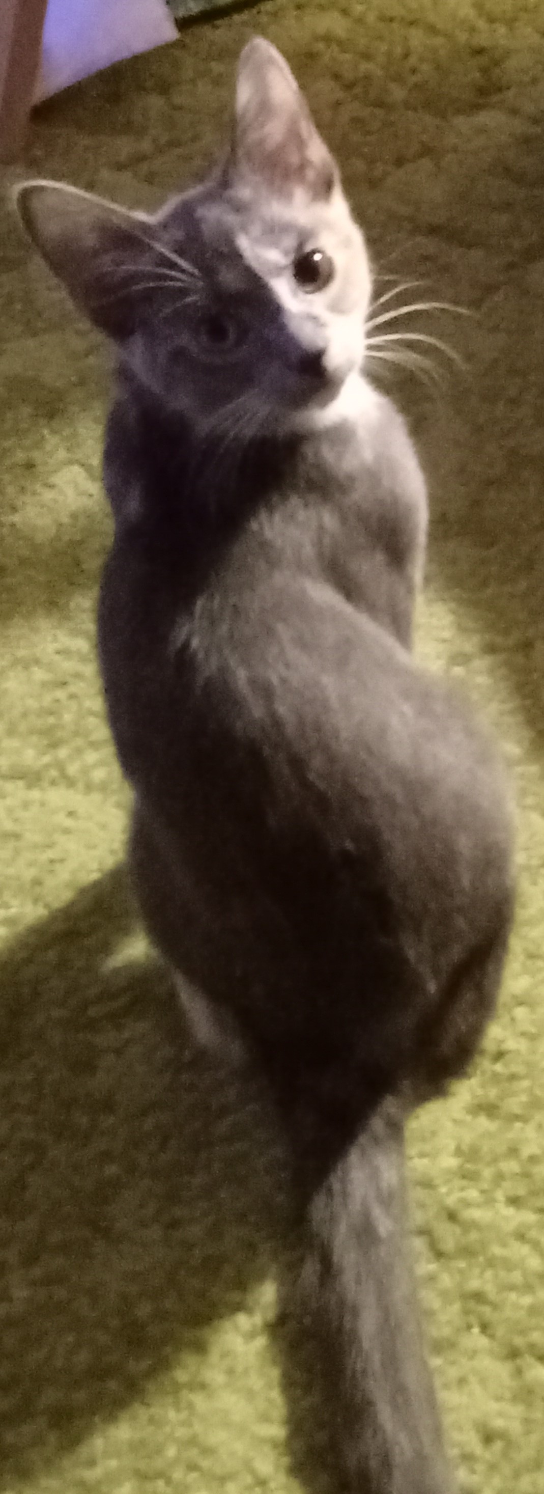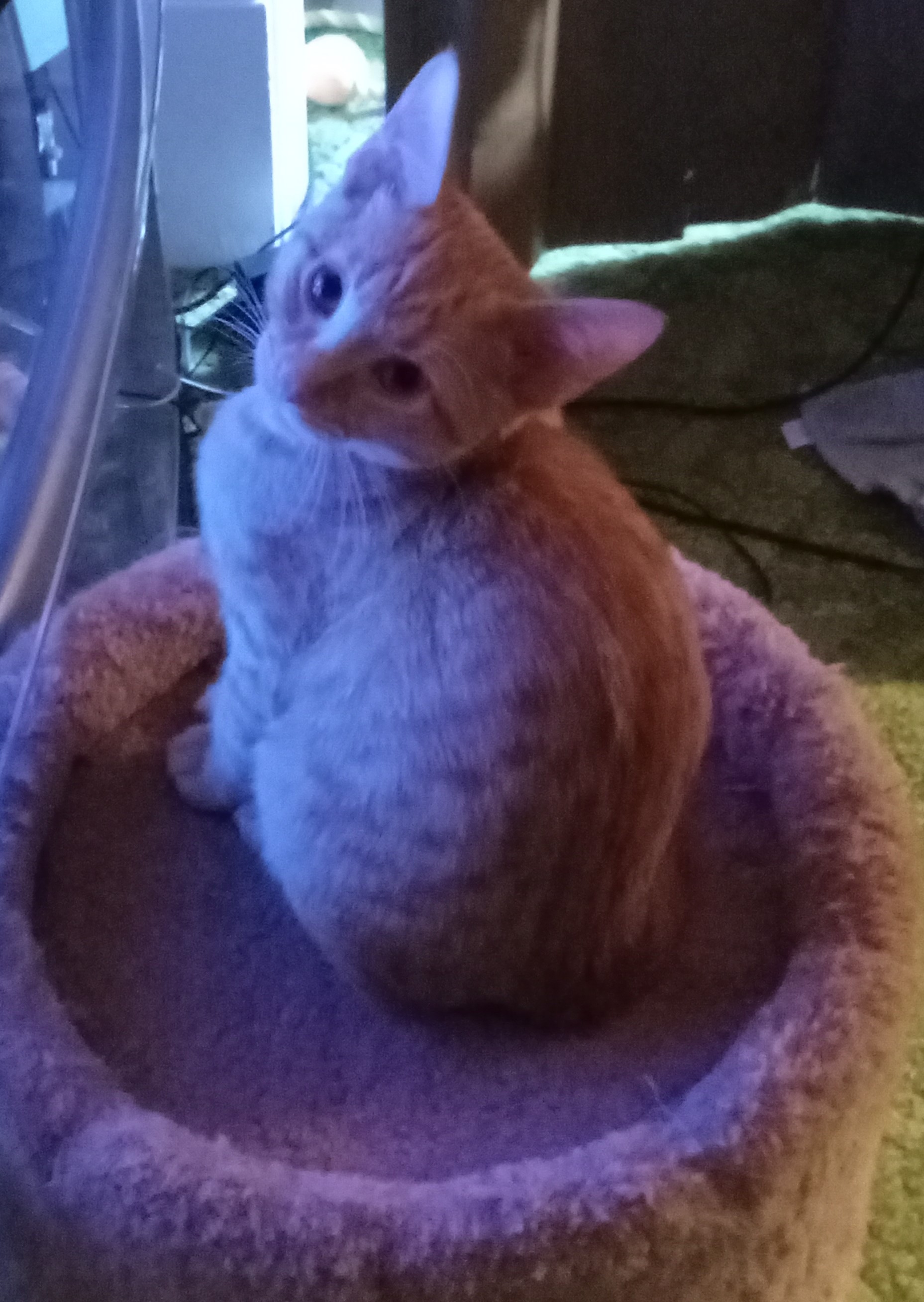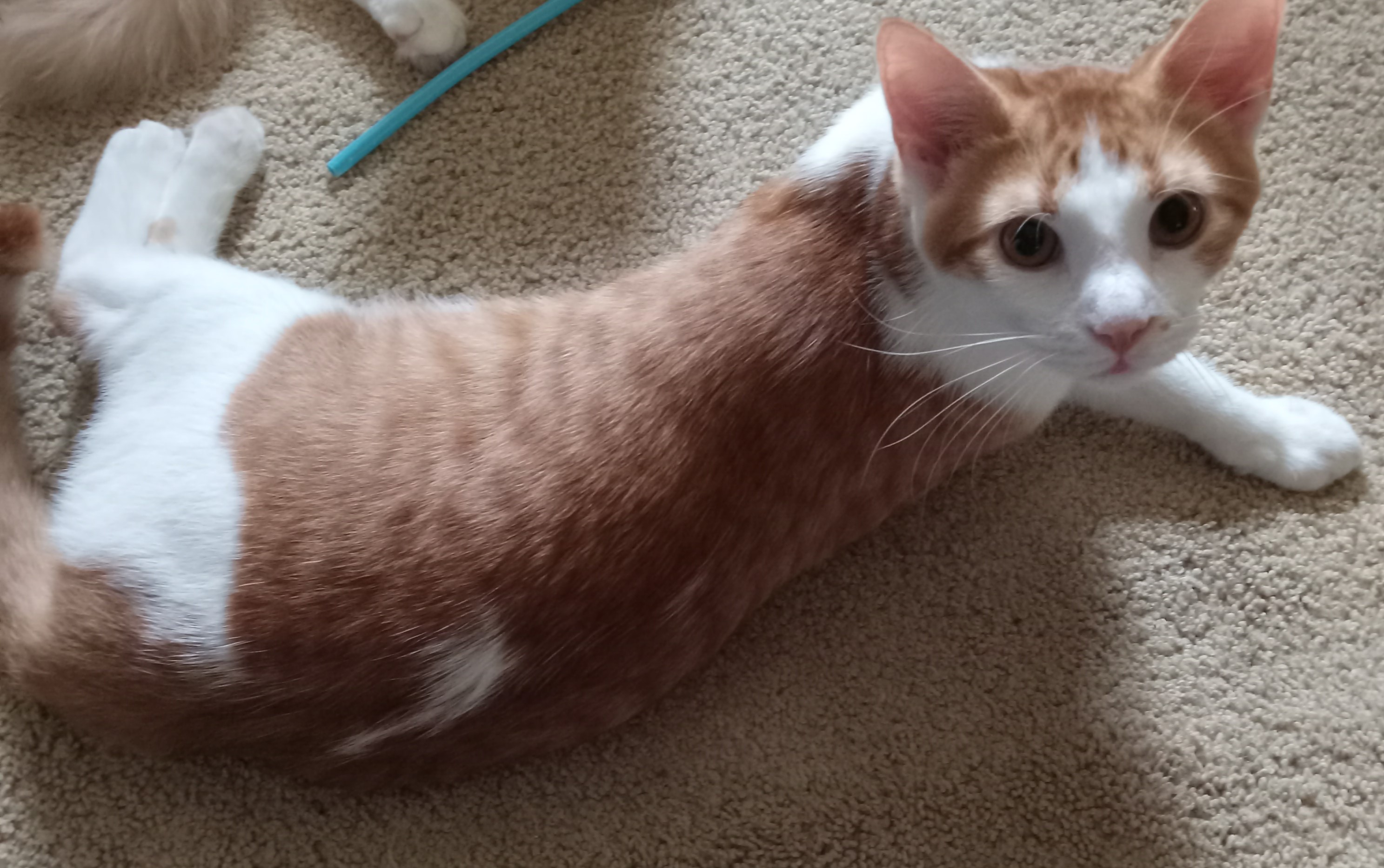His name is "Beefy. Male kitten, likes to go around and play with his siblings. He is the largest one out of the others.