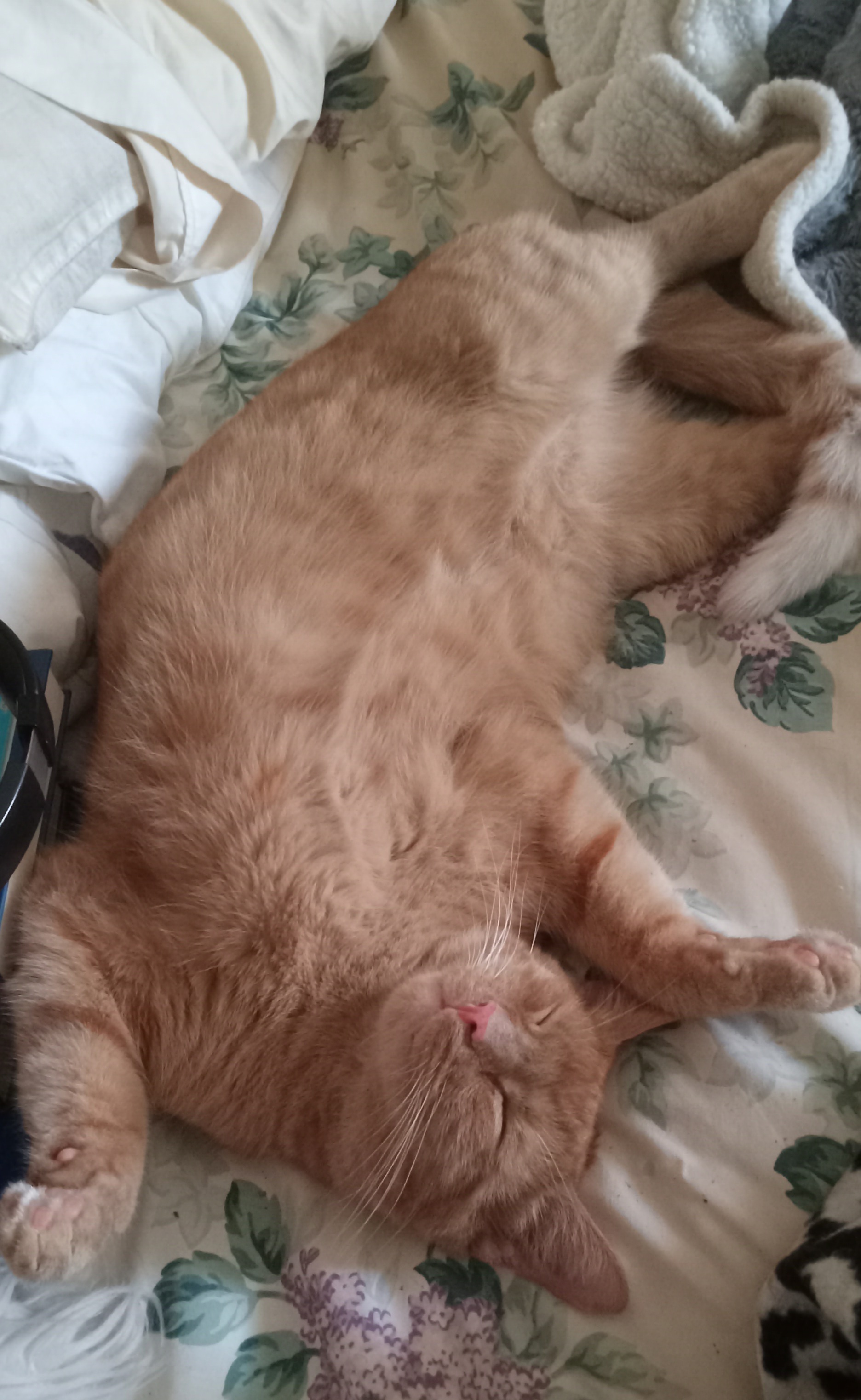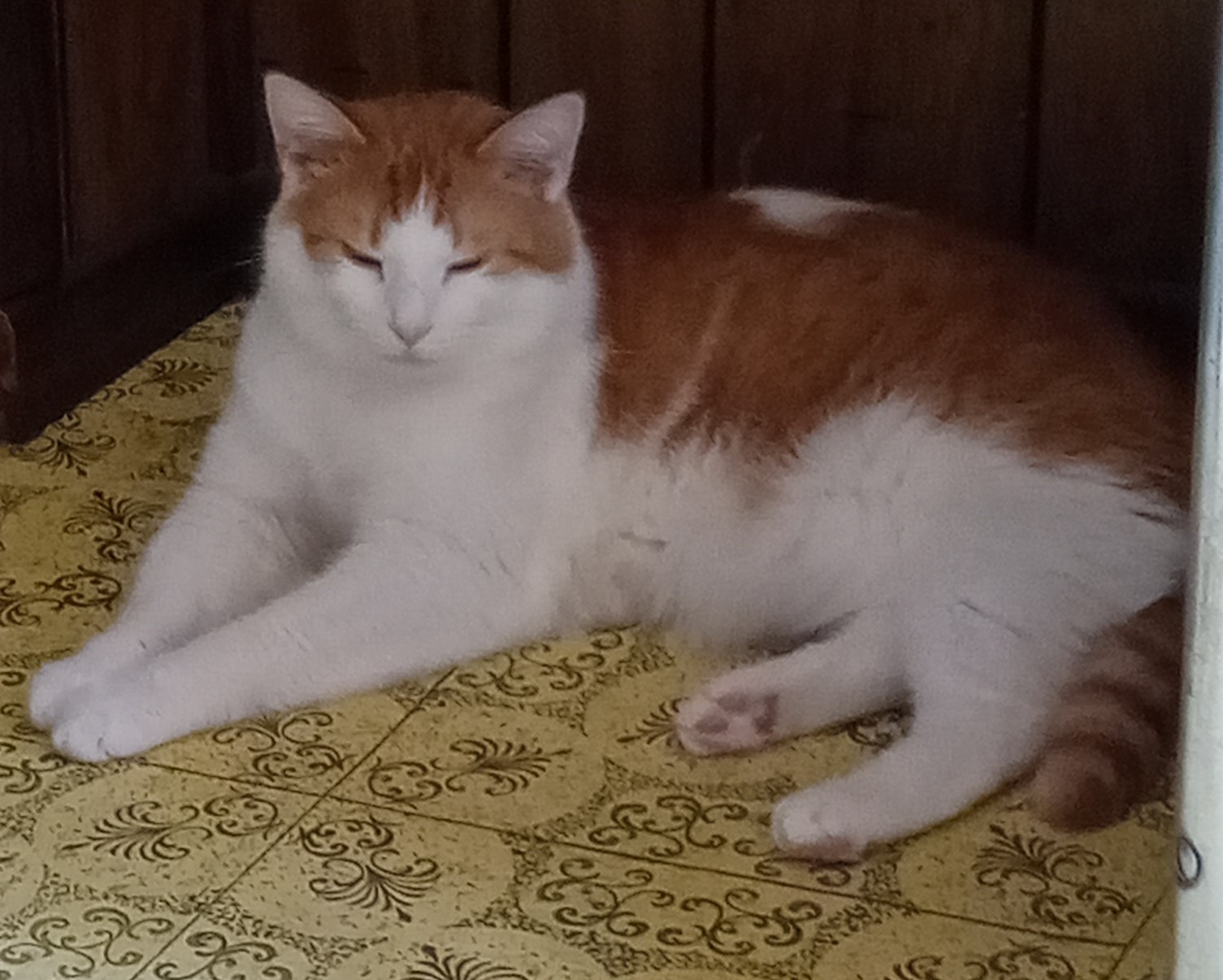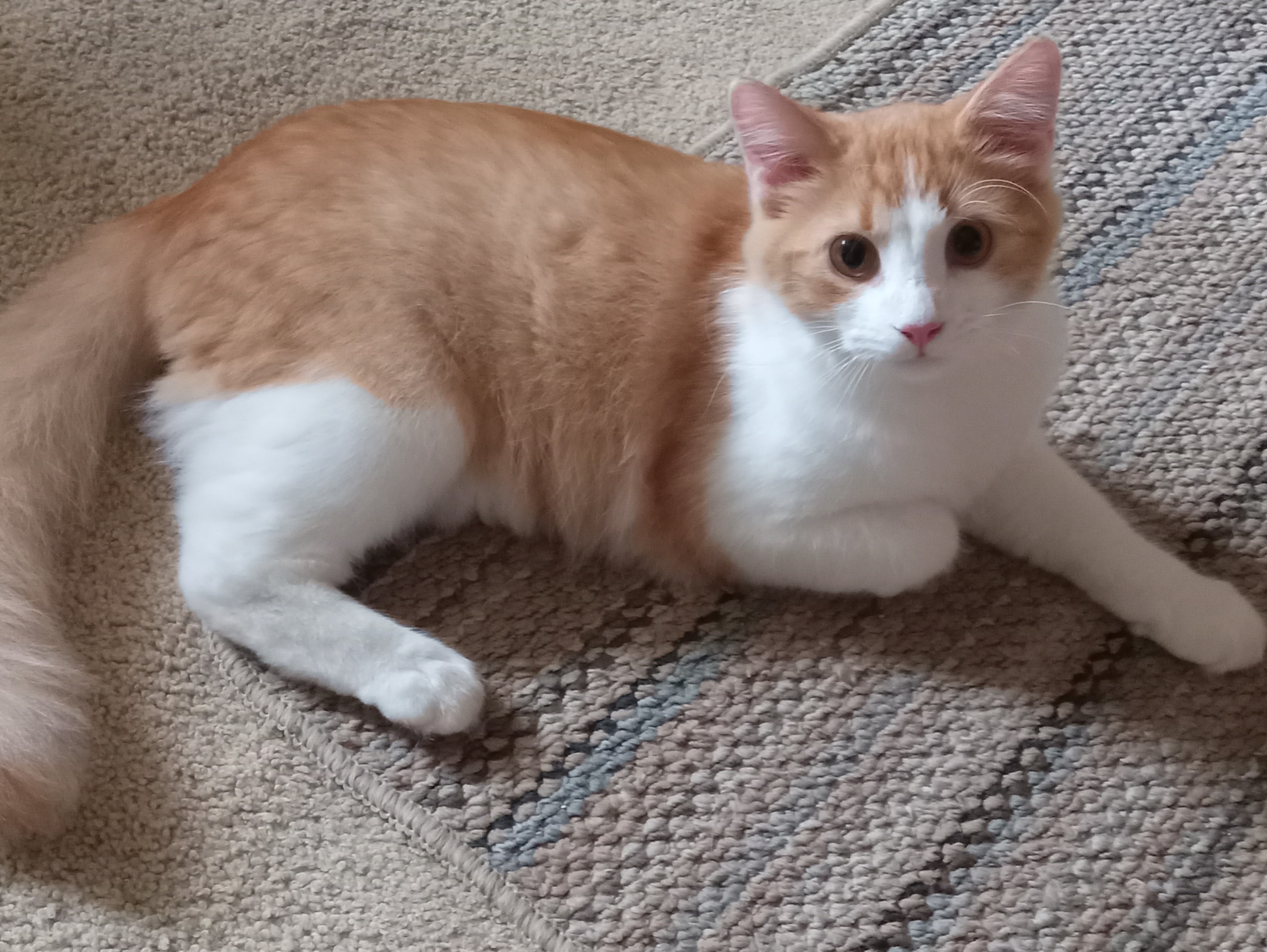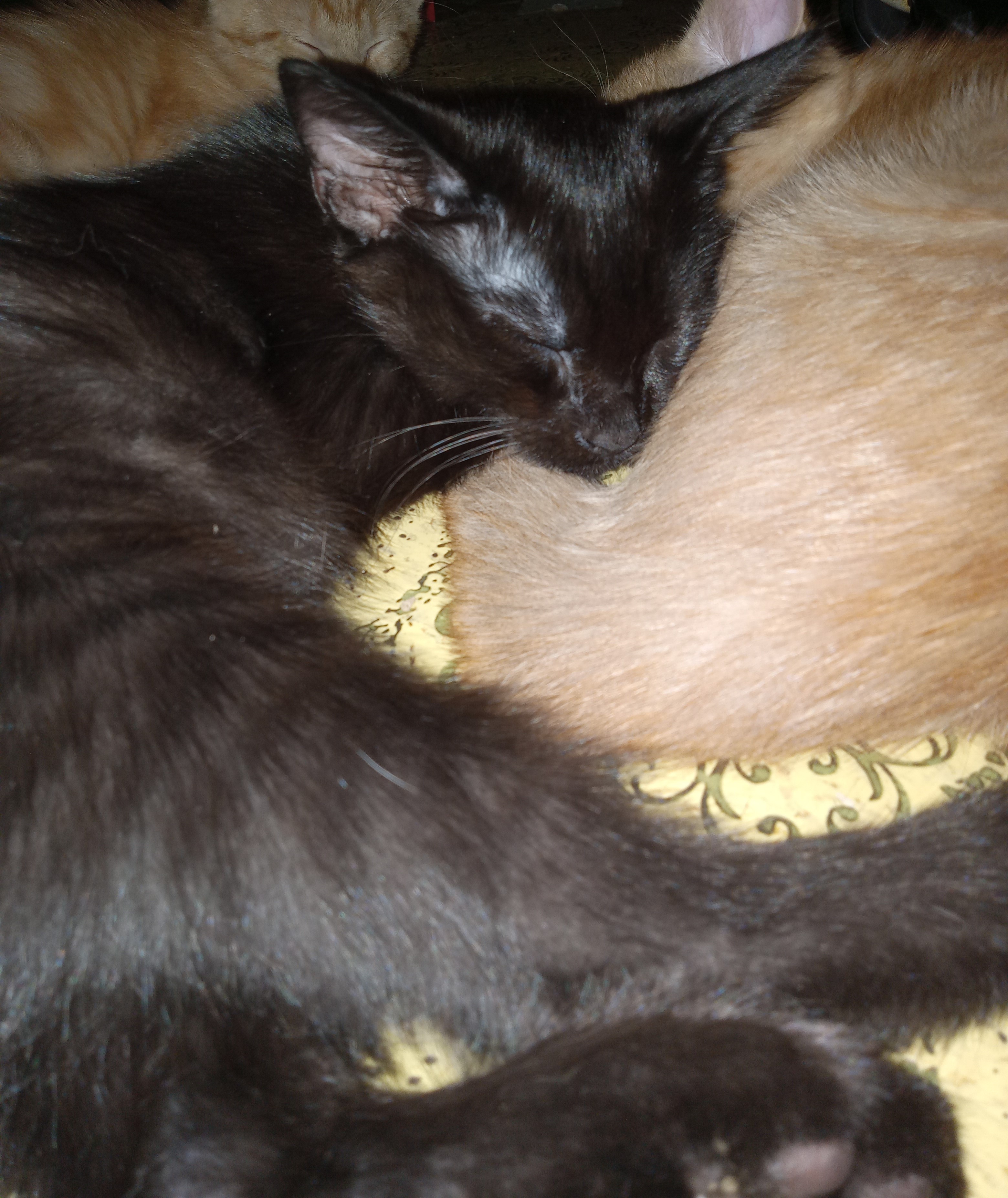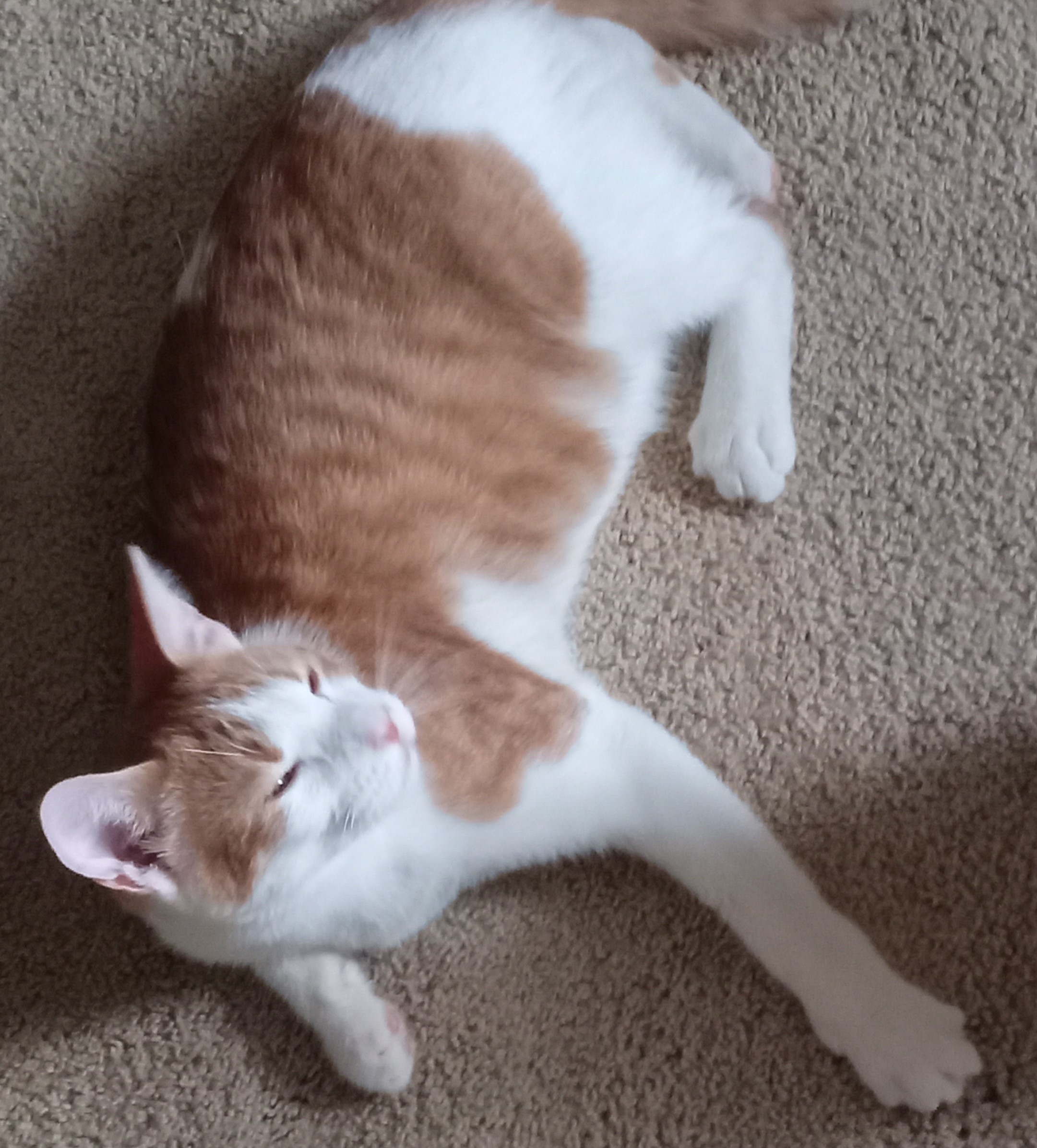 His name is "Beefy. Male kitten, likes to go around and play with his siblings. He is the largest one out of the others.